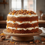 Влажный морковный бисквит с кусочками кураги, пряными нотками , прослоен нежным творожно-сырным кремом грецким орехом в карамели и мармелада из апельсина.