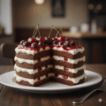Шоколадный бисквит, крем на основе Рикотты, и соус из вишни с кусочкам ягод.