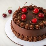 Сочетание шоколадного бисквита, пропитанные вишневым сиропом с прослойкой из вишневого мармелада нежного шоколадного мусса на основе натуральных сливок и темного шоколада.Вишневый конфитюр и сливочного ванильного крема.