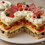 Сочетание тонких слоеных коржей, мясных деликатесов (колбаса,ветчина,бекон), овощей (помидор,соленый огурец,перец болгарский), грибного жульена, яичного блинчика, маслин, зелени и воздушного крема на основе сливок 33% жирности и творожного сыра. Торт очень вкусный, сытный и нежный.